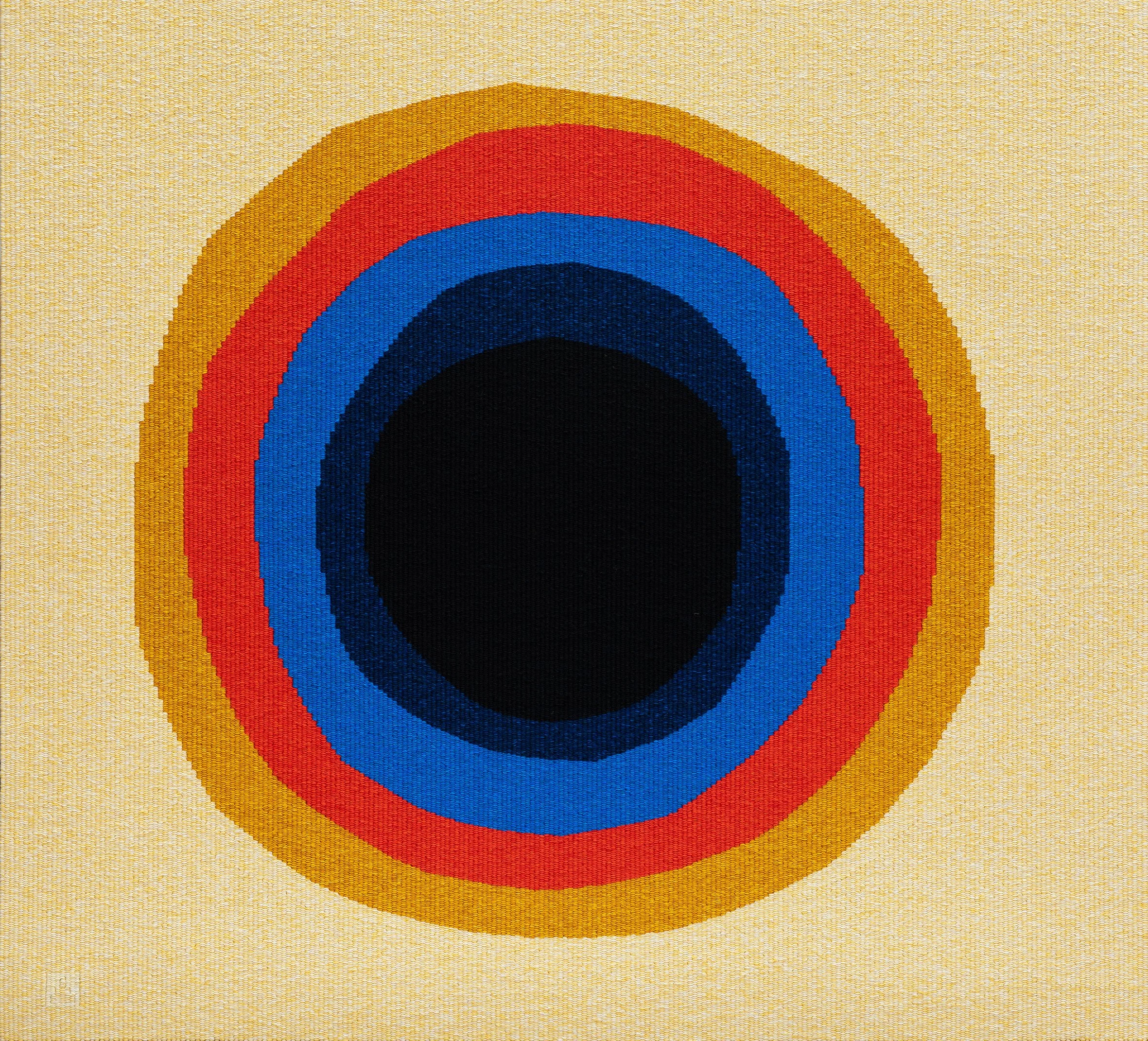 Cool, Down Stop Acting Crazy is a study of Hard-Edge + Colourfield art and how geometric order and pure colour can be emotive. The work rejects formal representations or gestures and instead encourages immersive contemplation. The concentric rings darken as they pull the viewer inward to a central focal point, in a hypnotic and meditative way. The syntax of the work layers each colour from darkest (in the centre) to lightest (outside) with primary-coloured tones. The use of hard-edges, scale, proportion and palette evoke sensory and emotional complexity without narrative content, enhancing a sense of presence in the room.